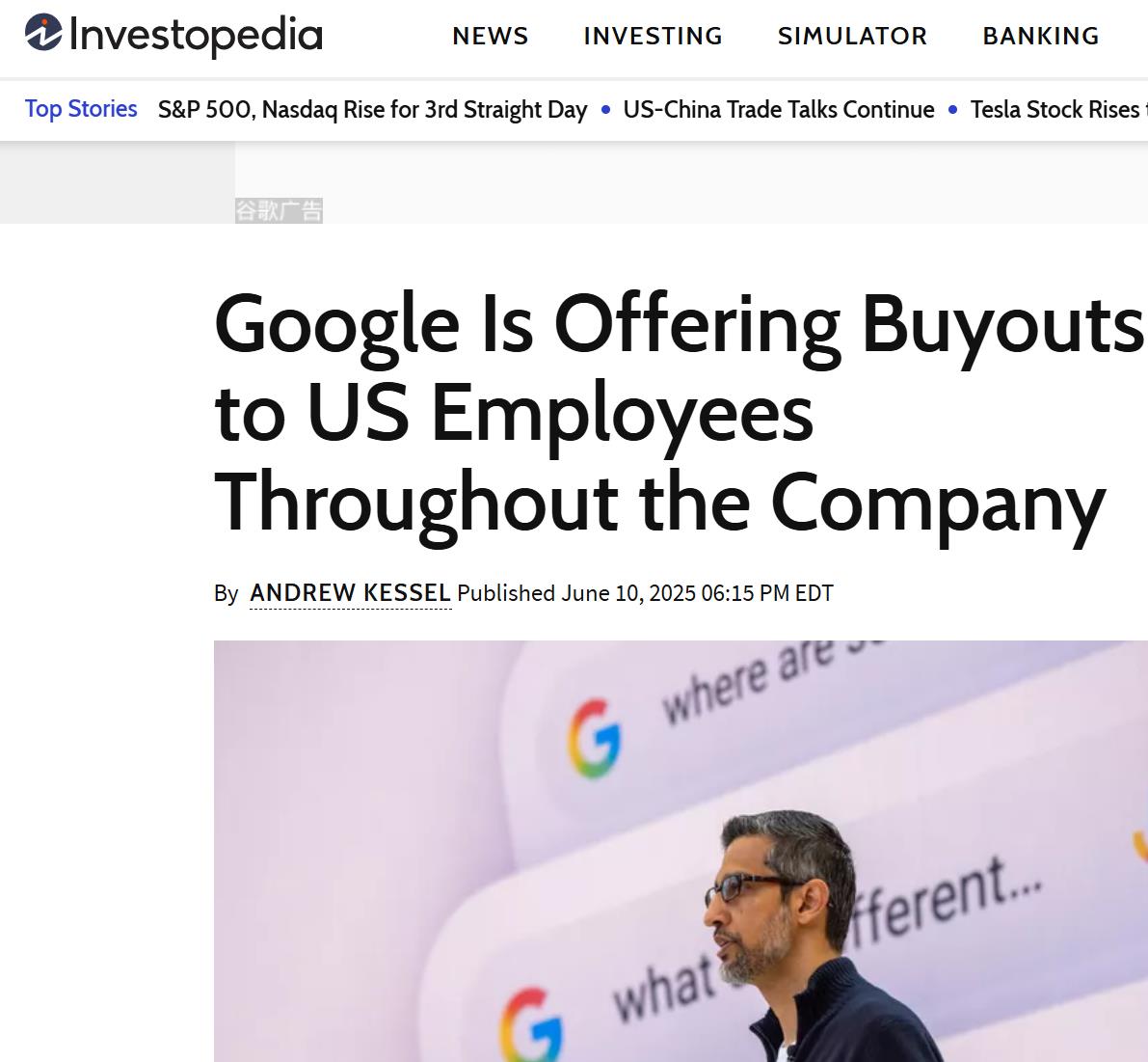 【环球网科技综合报道】6月11日消息,据外媒investopedia报道称,谷歌近期宣布,向多个部门的美国员工推出 “自愿离职计划”,涵盖知识和信息部门(包括搜索、广告和商务团队)以及核心工程、营销、研究和通信团队。